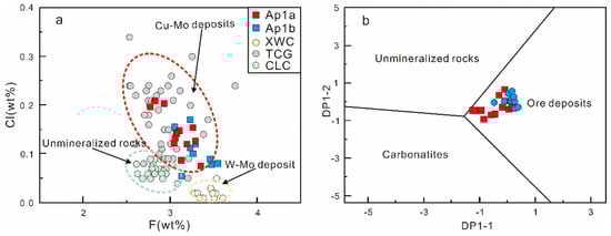 Magmatic apatite geochemical plots: (a) Cl vs. F, including data for ore-related porphyries (Tongchanggou and Xiuwacu) from Pan et al. [61] (points with values of less than 3.77 were selected) and for non-mineralization rock (Cilincuo) from Liu et al. [60]; their major compositions are listed in Supplementary Table S4; (b) DP1-2 vs. DP1-1 (after Mao et al. [19]).