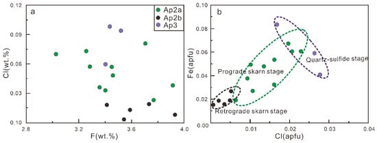The Cl content of Ap3 in the quartz–sulfide stage is greater than that of Ap2b and marginally higher than that of Ap2a (Figure 9a). Possibly, this increase is associated with decomposition of the Cl complexes. Cu is mainly transported as Cu–Cl complexes, such as [63,78]. The solubility of Cu and other metals in the hydrothermal fluids will decrease exponentially when the physical and chemical hydrothermal parameters change, such as the temperature dropping [79]. A large number of metal–sulfides such as pyrite, pyrrhotite, and chalcopyrite formed in the quartz–sulfide stage, indicating that decomposition of the complexes occurred between metals (Cu, Fe, Mo) and Cl. This process also increases the Cl− concentration in the hydrothermal fluids, which may lead to an increase in the Cl content of the apatite [77,80]. Although Ap3 is rare, it has the highest Fe content, and the Cl content is inversely correlated with the Fe content (Figure 9b). The inverse correlation between the Fe and Cl contents of Ap3 may be a sign of the co-crystallization of metal in the late stage of the skarn. In addition, Ap3 has a lower F content than Ap2b, indicating a lower F concentration in the ore fluids. During the ore precipitation stage, a significant amount of fluorite crystallized (Figure 2h), which mostly regulated the change in the F content of the hydrothermal fluids [65,81]. Thus, fluorite crystallization could be the cause of the decrease in the F content in Ap3.