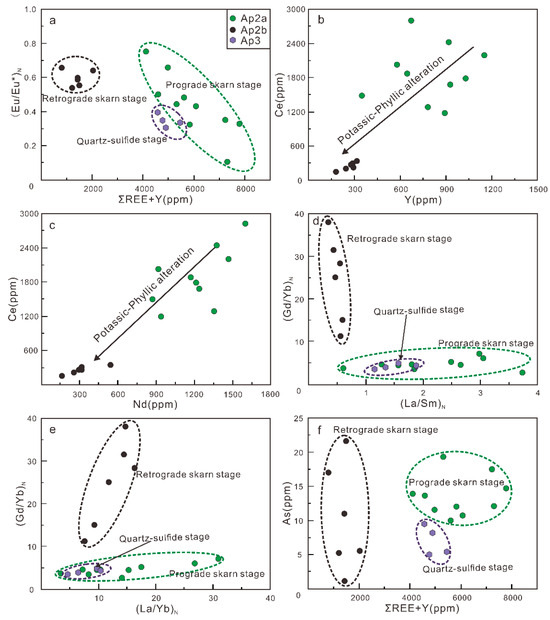 Hydrothermal apatite geochemical signatures and relationships of trace elements: (a) EuN/EuN* vs. ƩREE + Y; (b) Ce vs. Y; (c) Ce vs. Nd; (d) chondrite-normalized (Gd/Yb)N vs. (La/Sm)N; (e) (Gd/Yb)N vs. (La/Yb)N; (f) arsenic (As) vs. ƩREE + Y. Eu/Eu* = EuN × (SmN × GdN)−0.5. Chondritic values are from Sun and McDonough [58].