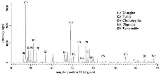 The copper concentrate used comes from a mining company in the Antofagasta Region, Chile. It was characterized using a micro-rotary separator (Quantachrome instruments, Boynton Beach, FL, USA), and a representative sample of 5 g was obtained. The chemical composition of the concentrate was determined through atomic absorption spectrometry (SpectrAA-50/55, Varian, Santa Clara, CA, USA). The mineralogical characterization was carried out using 3 techniques: Qemscan using a Model Zeiss EVO 50 (Zeiss, Oberkochen, Germany) with Bruker AXS XFlash 4010 detectors (Bruker, Billerica, MA, USA) and iDiscover 5.3.2.501 software (FEI Company, Brisbane, Australia); a scanning electron microscope (SEM) (JEOL J-7100F, Tokyo, Japan) operating at 20 kV under high vacuum conditions (Emitech K-950X, Lohmar, Germany) coupled with an energy-dispersive X-ray spectroscopy (EDS) microanalysis system (Oxford Instruments INCA, Oxfordshire, UK); and X-ray diffraction (XRD) analysis using a diffractometer (PANalytical, X’Pert PRO MPD Alpha1, Malvern, UK) operating from 4° to 100° (2θ), 45 kV, 40 mA, and Kα 1.54 Å, with a step size 0.017° and a time per step of 150 s. X-ray diffractograms were interpreted using the X’pert HighScore Plus v.3.0e software (PANalytical, Almelo, The Netherlands). And finally, the particle size distribution was determined using a Microtrac S3500 (Microtrac Inc., York, PA, USA).