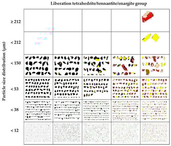 X-ray diffraction analysis (Figure 1) detected the predominant presence of enargite, followed by pyrite, chalcopyrite, digenite, and tennantite. The presence of arsenic in the sample is associated with minerals such as enargite and tennantite. Details about the mineralogical composition and the degree of mineral liberation in the sample were obtained through Qemscan analysis. Table 4 shows that the sample was predominantly composed of tetrahedrite/tennantite/enargite (35.93%), followed by pyrite (22.35%) and chalcocite/digenite (16.55%). These results align with the analysis conducted through X-ray diffraction. The analysis of mineral liberation (Figure 2) indicates that in the case of enargite, particles > 150 µm have a liberation of 20%. This indicates that these >150 µm particles are in direct surface contact with minerals such as pyrite, chalcocite/digenite, and bornite. Therefore, achieving dissolution depends on initially dissolving these associated minerals. Conversely, enargite particles ranging from 150 to 53 µm exhibit liberation levels of 95%–80%. As particle size decreases, the liberation degree is expected to increase. However, particles smaller than 12 µm are mostly found within the liberation range of 80%–50%.