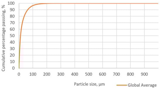 Figure 5 presents the particle size distribution curve in the concentrate. In this graph, the P80 value, which indicates that 80% of the concentrate particles are smaller, is 37.63 µm. Comparing this value with the liberation grade determined through Qemscan, it can be observed that, for the specific case of enargite, the liberation grade of the particle ranges between 80 and 95%. This suggests that enargite particles are not likely occluded or associated with other minerals.