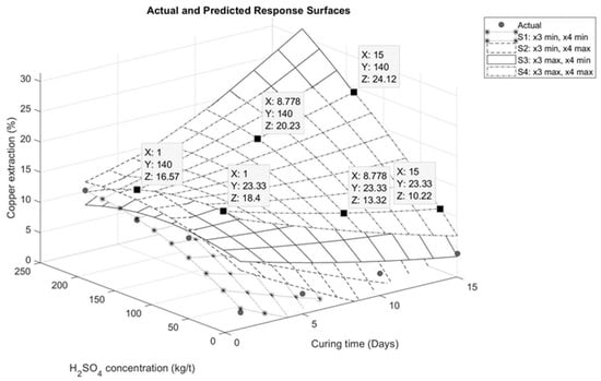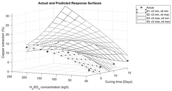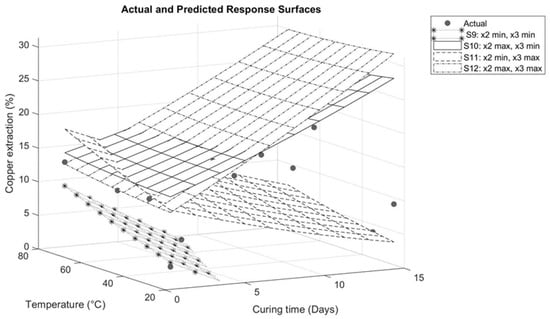 On the contrary, for surfaces S9 and S11, where the minimum sulfuric acid addition studied is kept constant, the temperature increase achieves a greater influence on copper extraction. Increasing the temperature from 25 to 75 °C for 1 day of curing in response surface S9 results in an increase in copper extraction from 3.37% to 9.68%. Similarly, in response surface S11, the extraction increases from 11.15% to 18.13%. The difference in extractions between the two surfaces is due to the fact that response surface S11 includes the addition of sodium chloride.