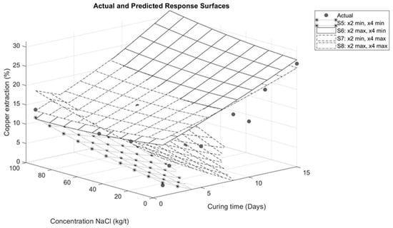 Figure 8 illustrates the interaction between sodium chloride addition and curing time. When analyzing curing times shorter than 7 days and increasing the amount of sodium chloride at response surfaces S6 and S8, it is observed that sodium chloride has a minor influence on copper extraction compared to times longer than 7 days. Therefore, in the case of these tests, adding a high amount of sulfuric acid (210 kg/t) and prolonging the curing time (more than 7 days) has a greater impact on copper extraction than adding sodium chloride. This is associated with the contact time between the solution and the mineral, as the curing time allows for the homogeneous distribution of chloride ions present in the solution. This distribution leads to a higher degree of porosity in the agglomerates, which helps to retain moisture []. However, increasing the addition of chloride ions does not necessarily increase copper extraction [,]. These results are consistent with those presented by Quezada et al. [], where curing time was a greater contributor to copper extraction than sodium chloride. Similarly, the findings reported by Cerda et al. [] indicate that temperature and curing time have a more significant effect than the addition of sodium chloride.