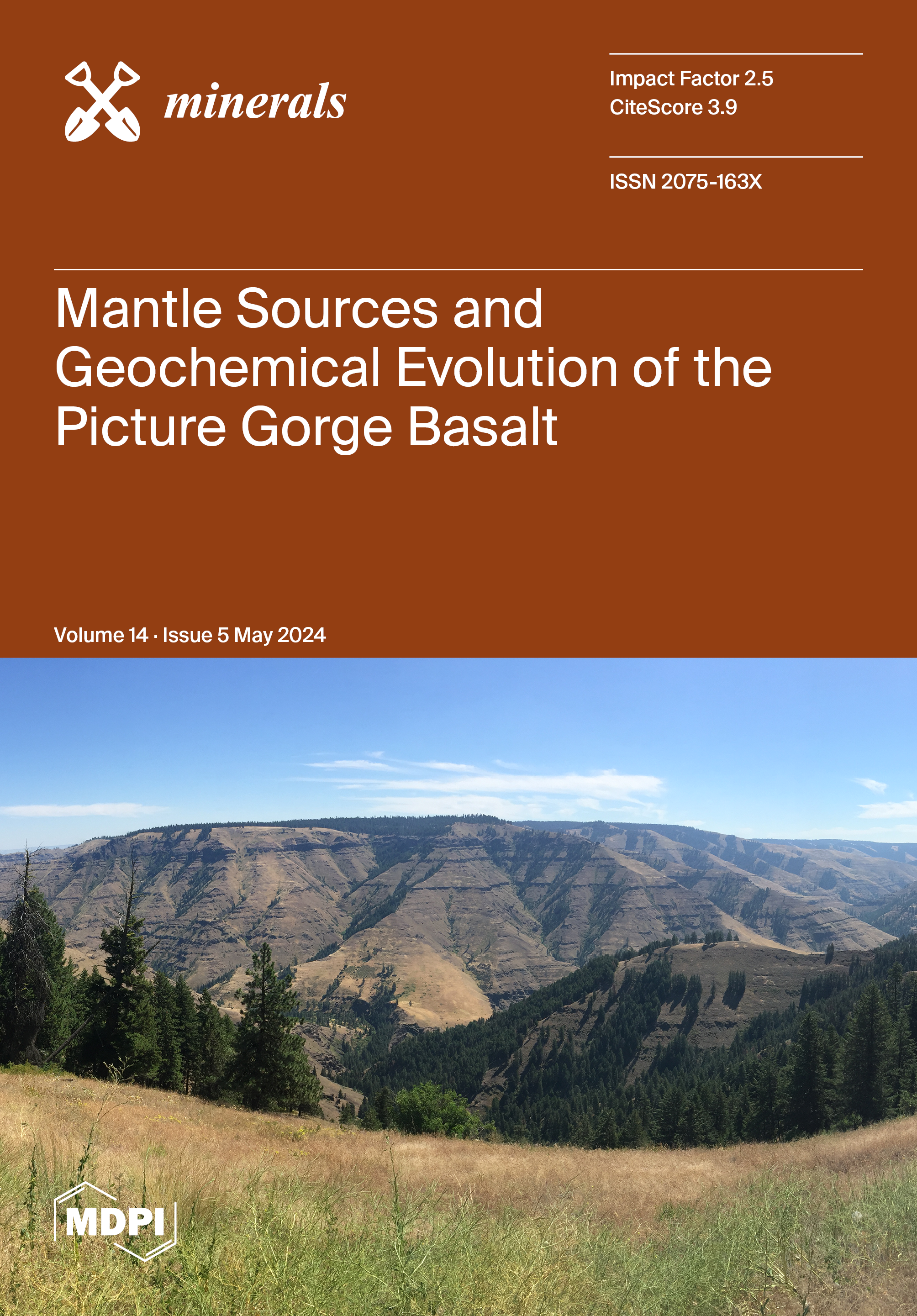 Cover Story: The cover is a generic photo of dikes and lavas in the Columbia River Basalts. The Columbia River Basalt Group (CRBG) is the youngest continental flood basalt province, proposed to be sourced from the deep-seated plume that currently resides underneath Yellowstone National Park. If so, the earliest erupted basalts from this province, such as those in the Picture Gorge Basalt (PGB), aid in understanding and modeling plume impingement and the subsequent evolution of basaltic volcanism. Using geochemical and isotopic data, this study explores potential mantle sources and magma evolution of the PGB. The relatively strong enrichment of LILE and depletion of HFSE coupled with depleted isotopic signatures suggest a metasomatized upper mantle as the most likely magmatic source for the PGB. View this paper