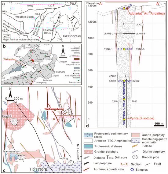 (a) Geological map showing the tectonic division of the NCC and the location of the CTD. (b) Regional geological map illustrating the distribution of the early Cretaceous magma, breccia pipes, and gold polymetallic deposits in the CTD. Geological map (c) and cross-section along the A-A’ transect (d) of the Tietangdong breccia pipe (modified after [14]).