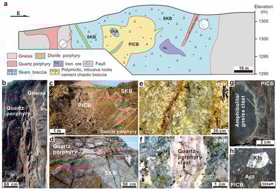 (a) Schematic cross-section showing the spatial distribution of different breccia facies, faults, and dikes in Tietangdong. Stereographic maps of faults along the margin of the Tietangdong breccia pipe are presented. (b) Quartz porphyry cutting the gneiss at the western part of the Tietangdong breccia pipe. (c) Outcrop of polymictic, intrusive rock cement chaotic breccia (PICB) and skarn breccia (SKB) in the middle of the Tietangdong breccia pipe. (d) Quartz porphyry cutting the SKB at the middle of the Tietangdong breccia pipe. (e) Massive skarn breccia (MSK) at the Tietangdong breccia pipe, displaying aggregations of massive prograde and retrograde skarn minerals with fine to medium grain sizes. Definitive contact boundaries between clasts and matrix/cement are absent. (f) Polymictic, skarn matrix-supported breccia (SMB) in the Tietangdong breccia pipe, exhibiting a matrix-supported texture. Polymictic, rounded to sub-rounded clasts include quartz porphyry, felsite, gneiss, and amphibolite. (g) PICB at the Tietangdong breccia pipe, where gray felsite (h) cements rounded gneiss and amphibolite clasts. Abbreviations: Kfs—K feldspar, Act—actinolite.