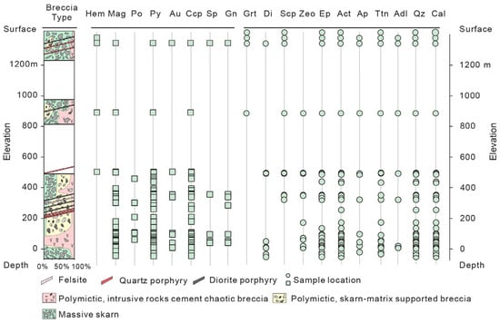 The breccia facies, intrusive sequences, and mineral associations along the section in the Tietangdong breccia pipe are illustrated in Figure 3. The results show that the proportions of MSK and SMB decrease with depth. However, the PICB increases with the depth in the Tietangdong breccia pipe (Figure 3). In addition, Figure 3 reveals a vertical zonation of sulfide and oxide mineral associations along the 1400 m section. This zonation encompasses two segments: (1) hematite and magnetite-bearing breccia above approximately 510 m above sea level and (2) magnetite, pyrrhotite, and pyrite-bearing breccia below 510 m above sea level (Figure 3).