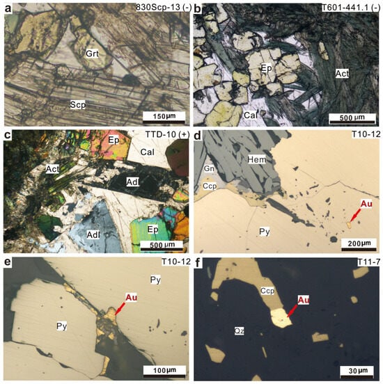 Microphotographs illustrating mineral associations and the occurrences of gold grains at the Tietangdong breccia pipe. (a) Garnet coexists with scapolite during the prograde skarn stage. (b) Epidote coexists with actinolite during the retrograde skarn stage, cemented by late-stage calcite. (c) Calcite and adularia at the quartz–sulfide–calcite stage cement the early stage epidote and actinolite. Microphotographs show anhedral native gold either as inclusions (d) or filling the interstitial of pyrite and chalcopyrite (e,f) at the Tietangdong breccia pipe. Abbreviations: Au—native gold, Hem—hematite, Py—pyrite, Ccp—chalcopyrite, Sp—sphalerite, Gn—galena, Grt—garnet, Scp—scapolite, Ep—epidote, Act—actinolite, Qz—quartz, Cal—calcite, Adl—adularia, ‘+’ —under cross-polarized light, ‘-’ —under plane-polarized light.