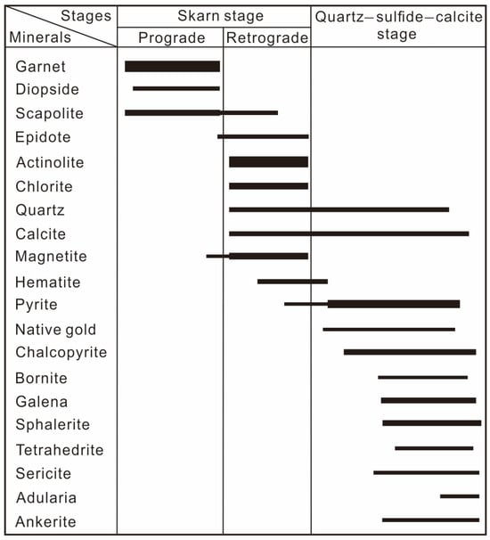 The Tietangdong breccia pipe exhibits three hydrothermal alteration and mineralization stages: the prograde skarn stage, retrograde skarn stage, and quartz–sulfide–calcite stage. The prograde skarn stage consists of garnet, diopside, scapolite, and minor magnetite (Figure 3 and Figure 4a). It is primarily concentrated in the shallow part of the breccia pipe (Figure 3, 800–1300 m above sea level). The retrograde skarn stage is characterized by scapolite, epidote, actinolite, magnetite, and minor sulfide minerals, with minor native gold (Figure 3 and Figure 4b). It is distributed throughout the breccia pipe, often replacing or cementing the prograde skarn minerals. The quartz–sulfide–calcite stage is represented by pervasive quartz, sulfides, calcite, and adularia (Figure 3 and Figure 4c–f). This stage is identified as the dominant gold mineralization stage. Native gold is mainly present as inclusions (5–35 μm) or filling the intergranular space of the texturally homogeneous pyrite and chalcopyrite of this stage (Figure 4d–f), with tiny irregular native Au grains (1–5 μm) sporadically adjacent along the margin of hematite, quartz, calcite, and chlorite grains [22]. The quartz–sulfide–calcite stage is distributed throughout the Tietangdong breccia pipe (Figure 3). The mineral paragenesis of the Tietangdong breccia pipe is summarized in Figure 5. In comparison to previous works [22,23], scapolite and adularia were first identified in this study. Although molybdenite was reported in an earlier work [22], we did not observe this mineral in this study (Figure 5).