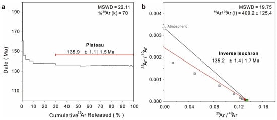 The 40Ar/39Ar dating results obtained for the adularia grains in sample TTD10 are illustrated as the 40Ar/39Ar spectrum and inverse isochron plots in Figure 6, with detailed data in Supplementary Material S2 (Table S2). The adularia 40Ar/39Ar spectra show anomalously old apparent ages at low-temperature steps, followed by several continuous plateau ages (135.9 ± 1.5 Ma, 2σ level, full external uncertainty considering the decay constant, Σ39Ar = 70%) at mid–high temperature steps (Figure 6a). The old apparent ages at low-temperature steps are interpreted as 39Ar loss in intercrystallite and/or damaged sites of adularia through recoil during irradiation [40]. Then, argon in the tight crystallographic reservoir of adularia releases at mid–high temperature steps and forms the plateau age (Figure 6a), which can be interpreted as the timing of adularia formation. In addition, the adularia grains also yield an isochron age of 135.2 ± 1.7 Ma (Figure 6b), which is consistent with its plateau age. This consistency supports the adularia formed at ca. 136 Ma in the Tietangdong breccia pipe.