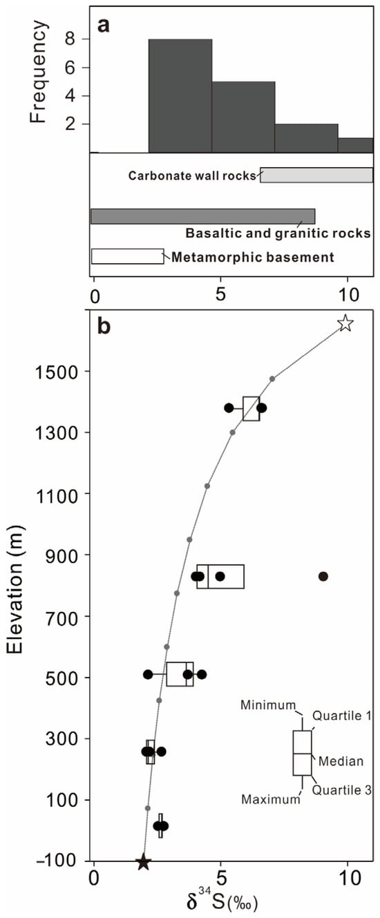 (a) Comparison of sulfur isotope results from the Tietangdong breccia pipe. The boxes represent the reported isotopic ranges of sulfur isotope values from different reservoirs [26,41,42]. (b) Depth profile of pyrite sulfur isotope from the Tietangdong breccia pipe. The linear regression curve illustrates a two-end member mixing trend between the magmatic–hydrothermal fluids (assuming 2‰ of δ34S and 1000 ppm of sulfur contents at an elevation of −100 m) and the ore field carbonate wall rocks (assuming 10‰ of δ34S and 200 ppm of sulfur contents at an elevation of 1450 m).