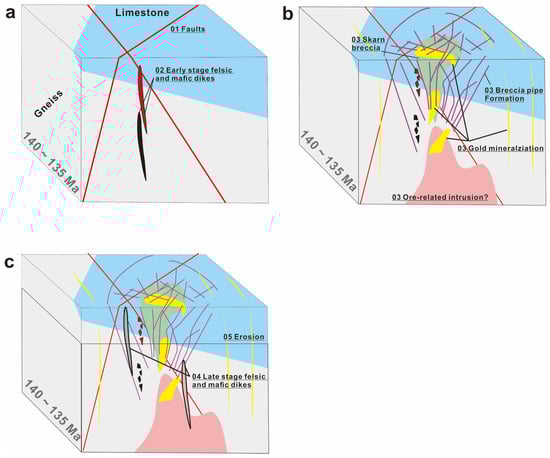 Based on field investigations, geochronology, and sulfur isotope analysis, we propose a genetic evolution model for the Tietangdong breccia pipe and the lode Au mineralization in Yixingzhai. During the Mesozoic, NW-/NE-trending faults in Yixingzhai became active, establishing connections with deep magma reservoirs. These activities facilitated the intrusion of felsite and diorite dikes and the formation of hydrothermal conduits at ca. 135–140 Ma (Figure 8a). Along these conduits, the magmatic–hydrothermal fluids, exsolved from the deep magma reservoirs through second boiling [4], were trapped in the shallow part due to the low permeability of superficial TTG and carbonate wall rocks. Subsequently, the conjunction between the faults and the dikes, identified as structural weak points in the ore field, lost stability due to the higher pressure of the accumulated volatiles compared to the resistance of the wall rocks. This process led to a series of fault displacements, wall rock ruptures, skarn alterations, and gold mineralization. Concurrently, the continued intrusion of felsic dikes contributed to the formation of intrusive breccia in the deeper sections of the breccia pipe (Figure 8a–b). These breccia and intrusive processes could have happened several times, as revealed through the geochemistry of the distinct zonation of garnet and epidote grains [22]. Simultaneously, lode Au mineralization occurred at the Yixingzhai TTG adjacent to the Tietangdong breccia, which hosted Au mineralization. Ultimately, the Tietangdong breccia pipe was intersected by late-stage quartz and diorite dikes, followed by subsequent erosion (Figure 8c). These late-stage quartz and diorite dikes are relatively fresh and lack gold mineralization (Figure 2d and Figure 3), contrasting with previous observations [22].