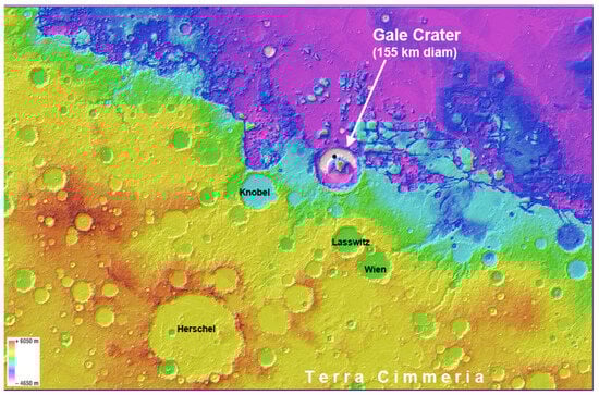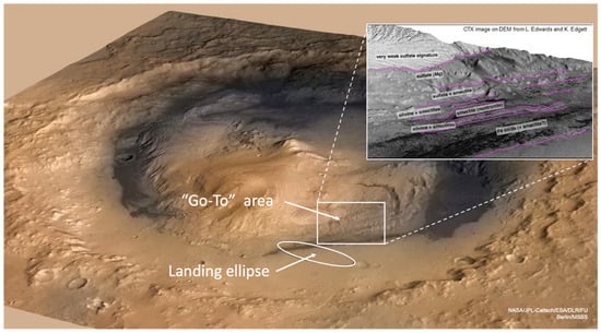 Gale crater’s formation dates to ~3.6–3.8 Ga []. Gale is one of a class of “overfilled” craters [,]: craters that after their formation filled with sediment, later to be partially exhumed by aeolian processes. The central peak of Gale is comprised of the remnants of this infilling sediment. Orbital infrared imagery and reflectance spectra revealed a vertical succession of sedimentary strata containing hydrous minerals (clay minerals, hydrated Mg sulfates, etc.) on lower Mt. Sharp that were hypothesized to have been formed in the presence of water (Figure 2) [,]. Gale crater was chosen as the landing site for MSL Curiosity based on these and other orbital images that were interpreted as the morphological remnants of an ancient crater lake, replete with stream channels and alluvial fans extending down from the crater’s northern rim, and flat-lying laterally extensive sedimentary strata shrouding Mt. Sharp.