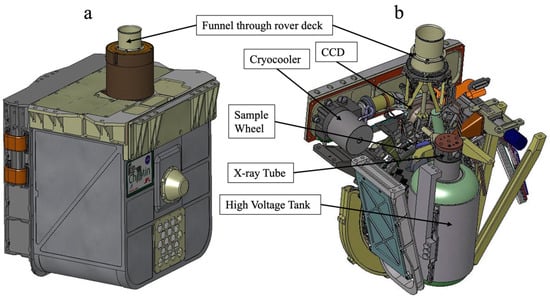 The CheMin XRD/XRF instrument, 30 cm × 30 cm × 30 cm, 10 kg. (a) The SA/SPaH delivers a sieved aliquot of powdered rock or soil through the funnel located at the top of the instrument, which penetrates the upper deck of the rover. (b) Internal components of the instrument (the image is rotated 180° about the vertical axis from (a), for clarity).