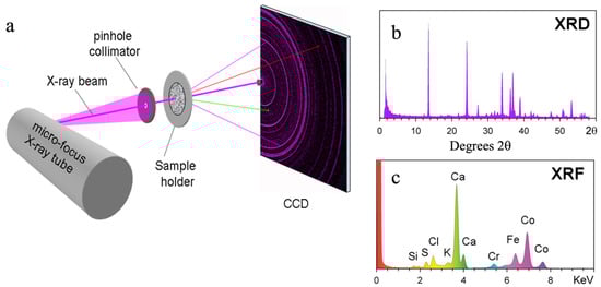 Geometry of the CheMin instrument. (a) Overall geometry of CheMin. (b) XRD 2θ plot obtained by summing diffracted photons from the characteristic Kα line of the X-ray source (CoKα X-rays colored magenta in (a)). (c) X-ray energy-dispersive histogram (EDH) obtained by summing all X-ray photons detected by the CCD, with fluoresced photons from the sample shown schematically in green and red in (a).