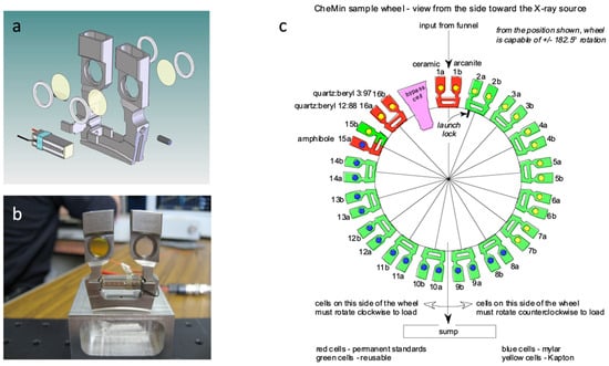 CheMin cell geometry. (a) Exploded view of dual-cell assembly, showing windows, tuning-fork assembly and piezodriver. (b) Assembled cell, ready for testing (Yellow Kapton window on left, clear mylar window on right). (c) The CheMin sample wheel, showing the location of sealed standard cells and open cells used for powder samples delivered by the SA/SPaH system. The cells are filled and analyzed at the top, then rotated 180° and emptied into a sump at the bottom of the instrument.