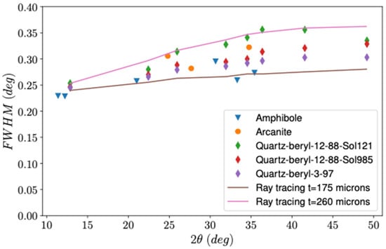 Measured FWHM peak widths for CheMin’s five standards (symbols) vs. ray-tracing results for 175 µm and 260 µm sample widths that best bracket the measured data. Cell windows are mounted on either side of a 170 µm spacer in the cell, yielding a nominal sample thickness of 170 µm. However, piezovibration during analysis causes the windows to beat like a drum, which increases the effective sample thickness in some cases.