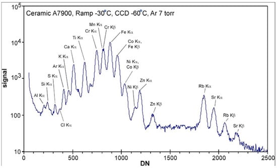 The CCD is operated in single-photon counting mode, meaning that single frames of data are collected and read often enough so that, in the vast majority of cases, each pixel will contain either a charge equivalent to the energy of a single detected photon or background. When operated in this fashion, the detector records both the energy and the x, y pixel position of each photon. The energy of a single electron–hole pair generated in silicon is 3.65 eV; if a CoKα photon is absorbed into a single pixel in the array, on average 6930 eV/3.65 eV = 1899 electron–hole pairs will be generated, which sum to the energy of the CoKα photon. Some energy losses can occur, for example, due to the secondary fluorescence of Si X-rays from the detector itself, or charge splitting between adjacent pixels. Figure 7 shows a histogram of X-ray energy (displayed as raw digital numbers or “DN” from the CCD) from a synthetic ceramic standard containing most of the elements of geologic interest above Z = 12, obtained with the CheMin flight instrument during cryogenic vacuum testing on Earth. CheMin was initially designed to have a capability for both XRD and XRF analysis of received samples, however, its XRF analysis capability was descoped for technical and cost reasons early in the flight instrument build.