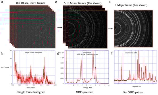 Data are downlinked from the spacecraft as 2D “minor frames.” Each minor frame is a 600 × 582 counting number array of CoKα photons, summed from 180 individual 10 s exposures of the CCD. A complete analysis typically includes the data from 15 to 45 minor frames of 30 min, each collected over two or more Martian sols. However, in some off-nominal analyses, for example when grain motion is poor due to clogging, the mineralogy of patterns containing as few as four minor frames has been successfully quantified, albeit with higher mineral detection limits (e.g., the Buckskin sample reported in []). All minor frames contain some off-ring blobs and spots due to cosmic rays, detector defects, etc. These are removed and replaced with local background values prior to the 2D to 1D conversion. Once downlinked, CheMin’s 2D Debye diffraction rings, corrected for arc length, are summed circumferentially around the central beam to yield a conventional 1D diffraction pattern using a modified version of GSE_ADA software v1.09 []. However, commercial software such as FilmScanTM (ICDD, Newtown Square, PA, USA) can be used as well.