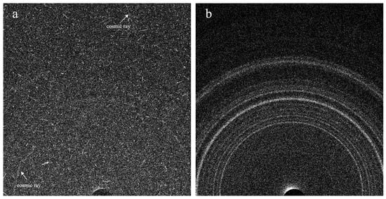 In a typical sample analysis lasting 10–30 h and occurring over 2–3 Mars nights, hundreds of ten-second integrations are collected and stored. Raw data consist of 600 × 582 arrays that store charge collected from individual CCD frames. The data are stored as DN (digital number energy bins) that are transformed to energy (in KeV) after downlink. Ideally, all raw frames would be transmitted to ground for processing, but the data volume is too large for this to be feasible. As a result, only a few frames of raw data are returned to monitor background, assess the health of the CCD, and to choose DN values suitable for background and high and low DN limits for energy-discriminated diffraction products. During the on-board processing of individual raw single frames, photons that fall within a window that brackets the energy of CoKα (6.93 keV) are summed into a 600 × 582 2D counting number array that constitutes an energy-selected CoKα Debye–Scherrer pattern of the sample. An energy histogram of all photons summed from the frames constitutes an X-ray fluorescence spectrum of the sample. An example of energy-selected diffraction and fluorescence data is shown in Figure 8. A minor frame is typically comprised of 180 10 s exposures. As many as 45 minor frames are summed to yield a high signal-to-noise 2D diffraction pattern for analysis. As a contingency measure, a diffraction product is constructed that is comprised of individual frames summed into a 600 × 582 array as raw data without energy selection (called “film mode” because the CCD collects photons in the same fashion as X-ray-sensitive photographic film). A single real number array holds the summed images for each minor frame. Figure 9a shows a single minor frame of film mode data from Rocknest, the first sample analyzed on Mars. The degradation of the image is due to the detection of a flood of neutrons and cascades of secondary X-ray photons from the rover’s Radioisotope Thermal Generator (RTG) power source (which contains several kg of plutonium) and cosmic ray background. For comparison, Figure 9b shows CoKα energy-selected data from six summed minor frames of a modern regolith target Rocknest (RN, sol 0095). All downlinked higher-level data products are described in [] and can be downloaded from the “Gale Crater Mineralogy and Geochemistry Sample Database” []. However, in all cases, energy-selected CoKα data are used in our published analyses.