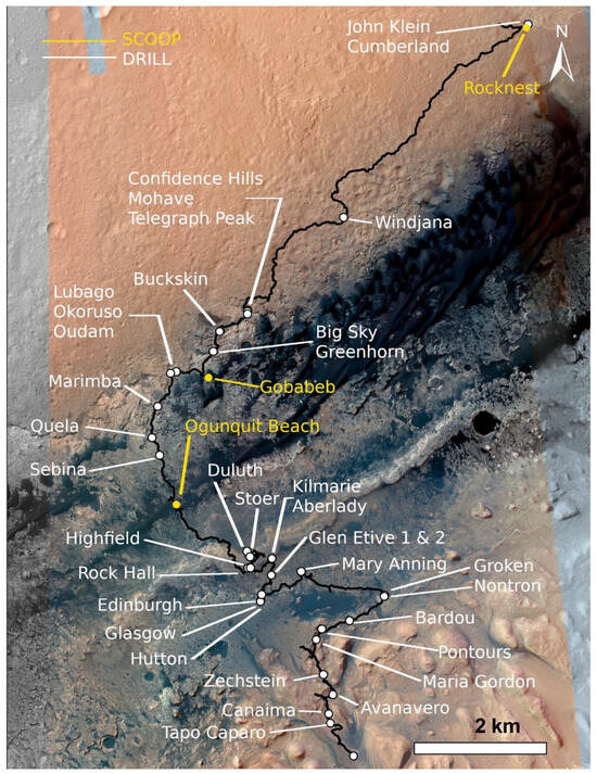 Plan view of Curiosity’s 12 year journey across Gale crater. Drilled rock samples are shown in white, scooped aeolian soil samples are shown in yellow.
