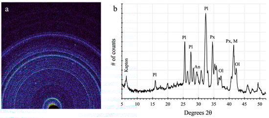 First X-ray diffraction pattern to be returned from Mars. (a) Colorized 2D pattern. (b) Obtained from (a), 1D pattern; most intense peaks of major minerals shown (Pl = plagioclase feldspar, An = anhydrite, Px = pyroxene, Ol = olivine, M = magnetite).