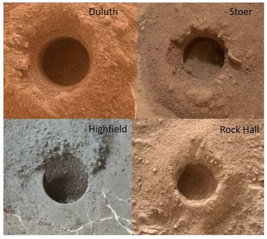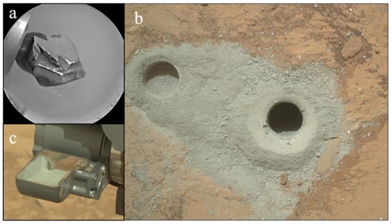 (a). Percussion drill bit used to drill and collect samples (16 mm dia). Powdered material is retained in the drill stem and transferred to the SA/SPaH system for sieving. (b) Image of shallow (1 cm deep) test drill hole (left) and the sampled drill hole (6.5 cm deep) from John Klein. (c) John Klein drill sample in the scoop reservoir before sieving to <150 µm (note red residue powder in the scoop which is contamination from the previous sample (Rocknest)). The delivered samples typically contain ~3% contamination from the previously drilled sample [].