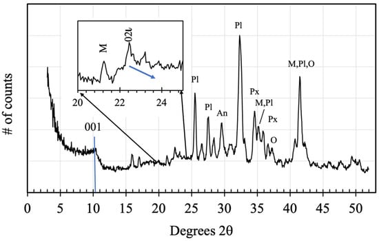 Diffraction pattern of John Klein, showing the position of the (001) reflection of smectite. Inset: portion of the pattern that contains the (02l) diffraction band of smectite. The maximum at 22.5° 2q indicates that the clay mineral is trioctahedral. Blue arrow denotes the turbostratic nature of the 02l band, extending beyond the band maximum. Phase assignments labeled for major peaks (Pl = plagioclase feldspar, An = anhydrite, Px = pyroxene, M = magnetite, Ol = olivine) (redrawn from [,]).