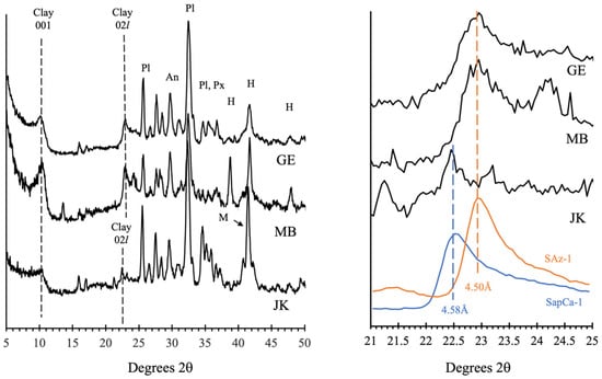 For 2:1 clay minerals, the occupancy and cation species within the octahedral sheet (i.e., dioctahedral vs. trioctahedral) are used for clay mineral identification and have important implications for mineral paragenesis. In terrestrial laboratories, the 06l band is used for this purpose, but this is beyond CheMin’s 2θ range. The 02l band (22.5° to 23.1° 2θ CoKα; 4.53 Å to 4.47 Å) is used for this purpose [], albeit with occasional interferences from diffractions from other minerals. NEWMOD software [] is used for detailed modeling of the (001) maximum of clay minerals (e.g., see [,]) and the BGMN software [] is used for detailed modeling of the 02l band in clay minerals (e.g., see [,]). Water release EGA data from SAM complement CheMin data and can also be used to discriminate between the types of smectite clays present in a drill target based on the temperature of the water evolution (e.g., []).