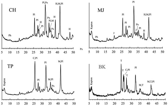 CheMin 1D X-ray diffraction patterns of drill samples Cumberland Hills (CH), Mojave (MJ), Telegraph Peak (TP), and Buckskin (BK) from the lower Murray formation. Major peaks are labelled (C = cristobalite, H = hematite, J = jarosite, M = magnetite, Ph = phyllosilicate, Pl = plagioclase, Px = pyroxene, T = tridymite).