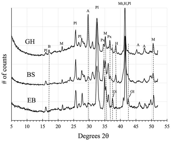 Table 1 lists the APXS compositions of aeolian materials from RN and GB (MSL) compared with average soils from Meridiani Planum and Gusev crater (MER). The striking similarity in composition between modern soil samples measured at various locations on Mars is compelling evidence that these materials represent a global soil average composition [,,]. The mineralogy of soils analyzed by the MER rovers was determined from mid-IR spectral deconvolutions, normative geochemical calculations, and Mössbauer spectroscopy [,,]. The mineralogy of RN, GB, and OG as determined by CheMin is chemically and mineralogically similar to that inferred for Martian basalts across the planet and broadly similar to estimates of the average Martian crust [,]. These basalts contain (or have normative chemical compositions consistent with) olivine, augite, pigeonite, and plagioclase feldspar. The mineral proportions of the crystalline components of RN, GB, and OG are virtually identical to those determined from normative calculations for the unaltered Adirondack class basalts from Gusev crater [,] (Table 2). The compositions of plagioclase, olivine, augite, and pigeonite from Rocknest and Gobabeb (determined from their refined lattice parameters [,,]) shown in Table 3 are a significant revision of those shown in [] and are the preferred values. The molar Mg/(Mg + Fe) ratios for olivine and pigeonite in both samples are similar: permissive evidence that they formed in the same environment. However, the augite is distinctly more magnesian and could not have formed in equilibrium with the pigeonite and olivine, suggesting that either the source basalts had a complex cooling history, or the pyroxenes came from different basalts [,,]. It should be noted, however, that the refined unit cell parameters and calculated crystal chemistries of pyroxenes in samples with more than one pyroxene species present have significant errors associated with them due to the relatively low 2θ resolution of CheMin.