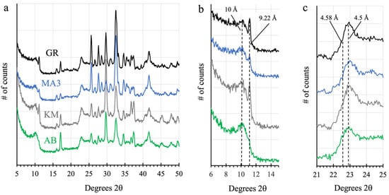In lower Mt. Sharp, clay minerals were found in virtually all analyzed samples. For samples in which clay minerals were not detected within the Mt. Sharp Group rocks, evidence of post-depositional diagenetic alteration is sufficient to explain their absence. For all but two clay mineral detections (in which the 02l band is either weak or obstructed by diffraction peaks from other minerals), the clay minerals can be identified as trioctahedral smectites, dioctahedral smectites, or mixtures of both. Rare exceptions include the sample Oudam (OU, sol 1363, −4435 m), which exhibited a peak at 9.6 Å, and the samples Kilmarie (KM, sol 2384, elevation −4155 m) and Groken (GR, sol 2912, elevation −4130 m), which exhibited a peak at 9.22 Å (in the case of KM and GR, a robust 10 Å smectite clay peak is present as well). Bristow et al. [] characterized the 9.6 Å basal spacing clay mineral in OU as ferripyrophyllite, likely exogenous material transported into the crater as sedimentary detritus from older bedrock. However, analyses of samples drilled higher in the section at Vera Rubin Ridge identified clay minerals having a 9.6 Å basal spacing in mineral assemblages that would support in situ diagenetic formation []. The 9.22 Å peak observed in the KM and GR samples is assigned to a mixed layer of serpentine/talc [] or minnesotaite/greenalite []. Bristow et al. [,] concluded that these clay minerals were likely exogenous material, transported into the crater as sedimentary detritus from older bedrock, whereas [] postulated that the mixed-layer clay formed via groundwater–lake water mixing.