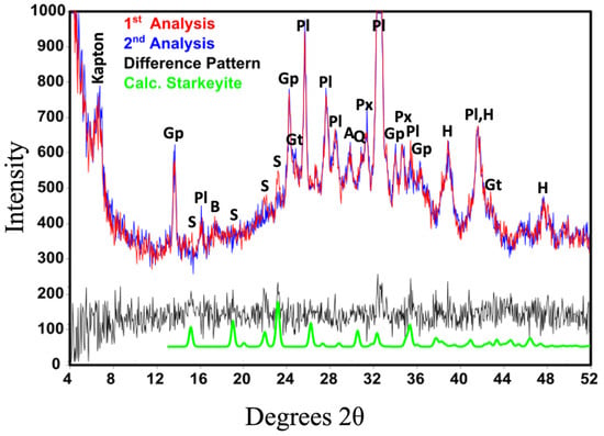 The collapse of smectite interlayers to a d001-spacing of approximately 10 Å induced by low RH conditions in CheMin permits identification of chlorite (d001 of about 14 Å) and mixed-layer chlorite–smectite (d001 between 10 and 14 Å). Indeed, the position of the 001-diffraction maximum of smectite in the Cumberland sample indicates partial intercalation by metal–hydroxyl groups (incipient chloritization), thought to indicate the presence of high pH fluids in these rocks [,]. The presence of other mixed-layer clays in Gale samples from the Glen Torridon region has been hypothesized based on a diffraction maximum at 9.2 Å. This peak is consistent with the presence of mixed-layer serpentine–talc-like mineral [,]. Kaolinite-group clay minerals have a distinctive diffraction peak at low 2θ that has not been observed in any sample to date.