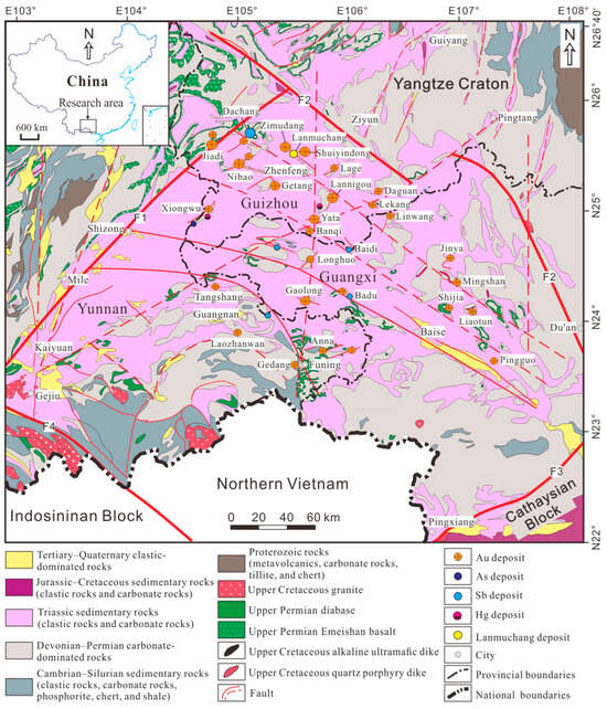 Regional geological map showing the distribution of Carlin-type Au and associated deposits in the Nanpanjiang–Youjiang metallogenetic area, SW China (modified from [2,3]). The thick red lines are basement-penetrating faults. F1 = Mile–Shizong Fault; F2 = Ziyun–Nandan Fault; F3 = Pingxiang–Nanning Fault; F4 = Red River Fault.