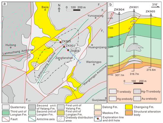 Geological map of the Lanmuchang deposit (a) and geological profile of exploration line No. 9 (b) (modified from [13,21]).