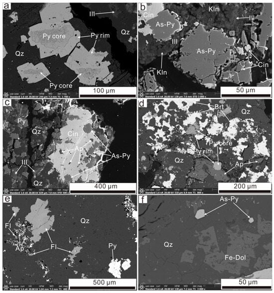 Backscattered electron images of various ores in the Lanmuchang deposit. (a) Banded pyrite coexisting with quartz and kaolinite; (b) coexistence of pyrite, cinnabar, illite, and kaolinite (cinnabar dissolved by pyrite); (c) coexistence of pyrite, cinnabar, illite, quartz, and apatite (cinnabar dissolved by pyrite); (d) coexistence of pyrite, barite, quartz, and apatite (apatite dissolved by quartz); (e) coexistence of fluorite, quartz, and apatite (fluorite dissolved by quartz); and (f) coexistence of dolomite, quartz, and pyrite (dolomite dissolved by quartz). Abbreviations: Ap = apatite, As-py = As-pyrite, Brt = barite, Cal = calcite, Cin = cinnabar, Dol = dolomite, Fe-Dol = Fe-dolomite, Fl = fluorite, Ill = Illite, Kln = kaolinite, Lor = lorandite, Py = pyrite, and Qz = quartz.
