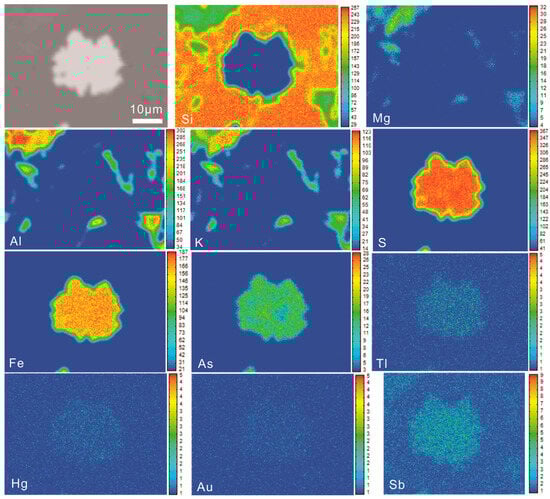 Gold primarily occurs in three forms in pyrite: invisible solid solution (Au+), nano-scale particles (Au0), and visible micrometer-scale inclusion [27,28,30]. Mercury and Tl are primarily incorporated in pyrite in the form of isomorphous solid solutions [28,29] or natural elemental minerals in micro-/nanophase mineral inclusions [31,32]. The EPMA scanning analysis of representative pyrites showed that Au, Hg, and Tl were relatively equidistributed (Figure 5). In addition, extremely high values were not observed for these elements in EPMA data (Table S2). These results indicate that Au, Hg, and Tl may primarily occur in pyrite in an “invisible” form (<0.1 μm).