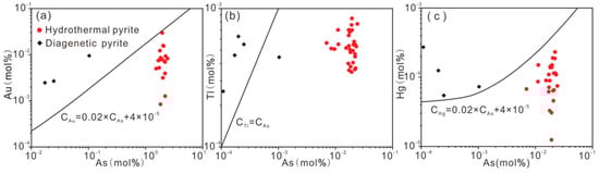 The solubility limit of Hg in As pyrite (CHg = 0.02CAs + 4 × 10−5) is similar to that of Au, whereas the saturation limit of Tl is close to the Tl = As line, that is, n(Tl)/n(As) = 1 [36]. As shown in the Tl vs. As and Hg vs. As diagrams, the data for hydrothermal and As-bearing diagenetic pyrite, respectively, are primarily distributed above and below the solubility limit curves (Figure 6b,c), indicating that Hg and Tl primarily occur in the form of a solid solution in As-bearing hydrothermal pyrite, whereas they primarily occur in the form of nano-scale particles in As-bearing diagenetic pyrite.