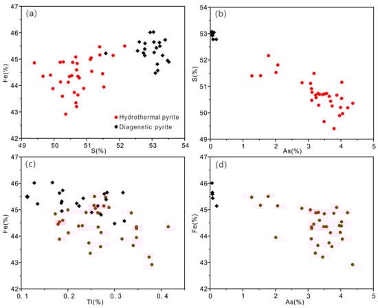 As shown in the Fe–S diagram (Figure 7a), hydrothermal and diagenetic pyrite are primarily distributed in the lower-left and upper-right sections of the plot, respectively. Iron and S are positively correlated, indicating that the degree of Fe and S loss in pyrite gradually increased from the diagenetic to hydrothermal periods, which may reflect the gradual increase in the degree of Fe and S replacement by other trace elements. In addition, a significantly negative correlation was observed between the S and As contents (Figure 7b); that is, from diagenetic to hydrothermal pyrite, the S concentration sharply decreased, and the As concentration increased. This indicates that As in hydrothermal pyrite may replace S in the mineral lattice. The results of previous studies demonstrated that As replaces S in pyrite and generally forms covalent As–S bonds [37,38]. However, because the radius of As is greater than that of S, substitution causes pyrite lattice distortion and produces defects [37,38]. The destruction of the crystal structure is conducive to the incorporation of other trace elements (e.g., Au, Hg, and Tl) [37,38,39,40]. In addition, As, as a variable-valence element, can replace Fe in pyrite in the form of As2+/3+ and thus increase the solubility of other trace elements [39,41,42]. In this study, negative correlations were observed among Fe, As, and Tl in pyrite (Figure 7c, d), which further indicates that Fe in pyrite may be partially replaced by As or Tl. In conclusion, the Au content in hydrothermal pyrite primarily depends on the As concentration. However, the Au–As relationship diagram indicates that there is no correlation between Au and As in hydrothermal pyrite (Figure 7a). Deditius’s [40] research showed that pyrite data primarily obtained from secondary ion mass spectroscopy analysis form a wedge-shaped area in the Au–As diagram, indicating that the Au content increases with the increase in As content, whereas data obtained from EPMA analysis exhibit no notable relationship between Au and As. Therefore, the lack of correlation between As and Au may be due to detection limits, which would reveal more detail if measured in ppm or ppb instead of wt.%.