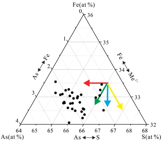 As–S–Fe triangle diagram of hydrothermal pyrite in the Lanmuchang deposit (base map from [40]). Four different trends show substitution of (i) As for S (As1−–pyrite, red arrow), (ii) As2+ for Fe (As2+–pyrite, green arrow), (iii) As3+ for Fe (As3+–pyrite, blue arrow), and (iv) Me2+ for Fe (yellow arrow).