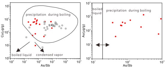 Copper, Au, and As/Sb of hydrothermal pyrite from the Lanmuchang deposits indicate fluid boiling (base map from [57]). The data of the black hollow squares are from [51], and the data of the red solid circles are from this study.