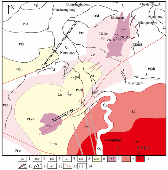 Geological map of the Xichanggou ore field. 1—Quaternary; 2—stromatolite dolomite; 3—interbedded quartz sandstone and shale; 4—argillaceous dolomite; 5—quartz sandstone; 6—grey black shale; 7—granite porphyry; 8—medium fine-grained syenogranite; 9—coarse-grained syenogranite; 10—quartz porphyry; 11—diorite; 12—geological boundary; 13—structure; 14—borehole.