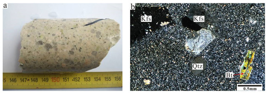 Petrographic properties of of Xichanggou granite porphyry. (a) Photograph of Granite porphyry from drill core; (b) Photomicrograph (cross polarized light) of phenocrysts of potassium feldspar, plagioclase, quartz, and biotite in a groundmass of the same assemblage. Kfs—potassium feldspar; Qtz—quartz; Bt—biotite.