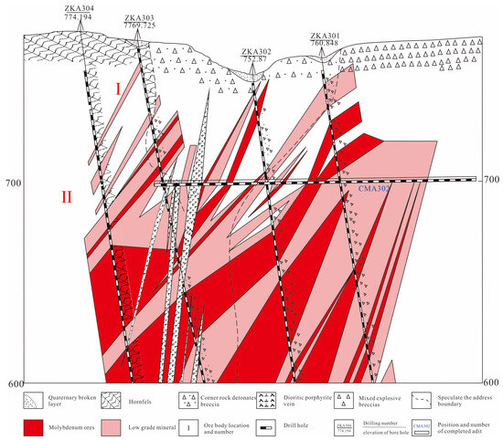 Molybdenum ore deposits are found in cryptoexplosive breccia and granite porphyry formations (Figure 4). An extensive examination identified a single pyrite ore deposit and fourteen molybdenum ore deposits, most of which remain hidden. The project controls three ore deposits, namely I, II, and III. The primary ore deposit (referred to as the II ore body) that is being managed by the project has a length of 500 m, a maximum thickness of 224.72 m, and an average grade of 0.0728%. The ore bodies primarily exhibit irregular lenticular shapes, and the continuity of mineralization is favorable. However, the occurrence of mineralization varies significantly.