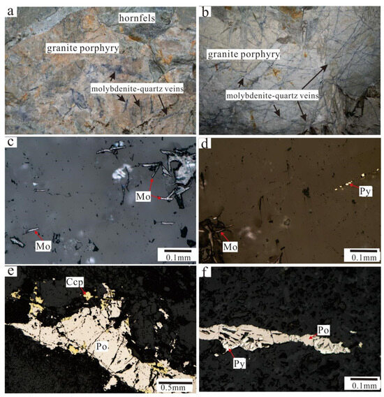 The Xichanggou molybdenum ores. (a) Photograph of molybdenite mineralization in mixed breccia of the Xichanggou deposit; (b) Photograph of molybdenite quartz veinlets in Xichanggou silicified cataclastic granitic porphyry; (c–f) Photomicrographs in reflected light of sulfide minerals in the mineralizing assemblage. Mo—molybdenite; Py—Pyrite; Ccp—chalcopyrite; Po—pyrrhotite.