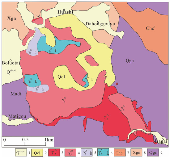 Geological map of the Huashi ore field (modified from [19]). 1—Quaternary alluvial deposits; 2—Quaternary colluvial deposits; 3—Flesh-red alkali feldspar granite; 4—Gray–white alkali feldspar granite; 5—Iron manganese material enrichment range; 6—Containing Tianhe alkali feldspar granite; 7—Quartz sandstone in the first member of Changzhougou Formation; 8—Xiaoguanzhuang gneiss; 9—Qiuhuayu gneiss.