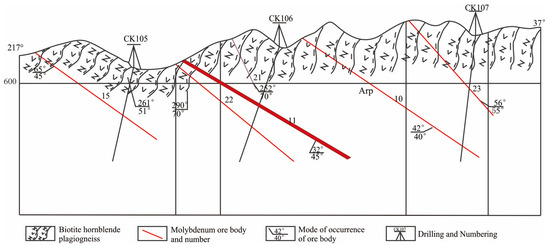 The Huashi molybdenum deposit is situated within a distance of 100 m north of the Madi intrusion. The ore body mainly occurs in the biotite hornblende plagioclase gneiss and plagioclase amphibolite series of the Malanyu Formation of the Archean Zunhua Group. The occurrence of molybdenum mineralization is mostly influenced by the NW–NNW- and NE-trending faults resulting from magmatic intrusion and tectonic processes in the region. The ore veins mainly develop along the rock fracture zone resulting from the NW–NNW fault. The predominant form of molybdenum mineralization is characterized by molybdenite quartz veins (Figure 7). The ore veins are arranged in a north–south distribution, encompassing No. 2, No. 4, No. 6, No. 17, No. 13, No. 14, No. 20, No. 22, No. 15, No. 12, and No. 11.