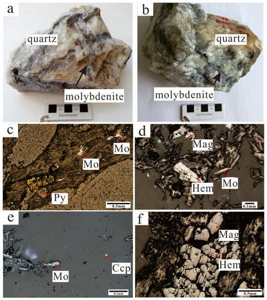 The Xichanggou molybdenum ores. Photograph of (a,b) Molybdenite–quartz veins; Photomicrograph in reflected light (c–f) Ore minerals forming the mineralized assemblage. Mo—molybdenite; Py—Pyrite; Ccp—chalcopyrite; Mag—magnetite; Hem—hematite.