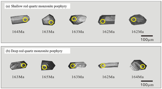 Cathodoluminescence (CL) images of zircon crystals from the Xichanggou granite porphyry:(a) CL images of zircon crystals from shallow red quartz monzonite porphyry; (b) CL images of zircon crystals from deep red quartz monzonite porphyry.